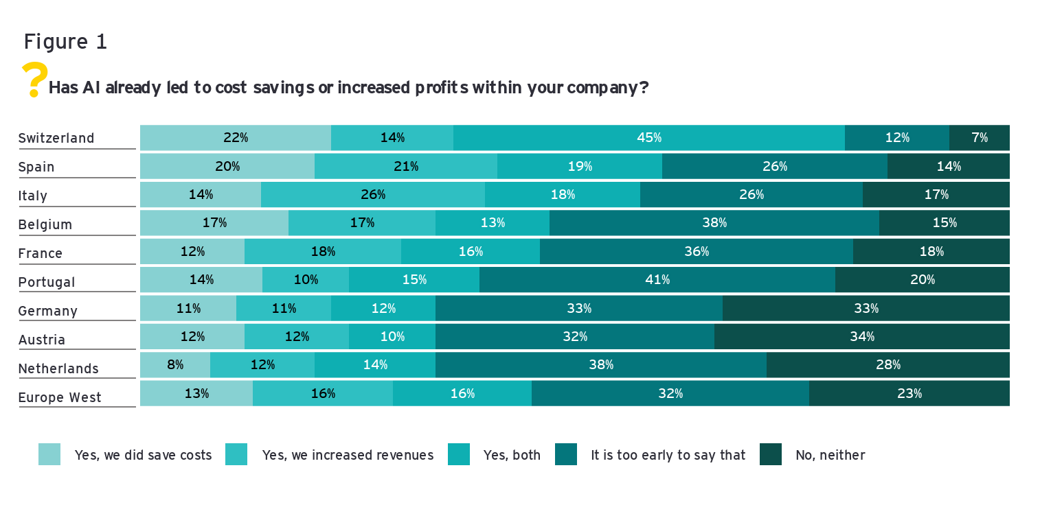 By function, the use cases in which AI has been operationalized vary widely, from streamlining supply chain operations to optimizing marketing strategies and enhancing customer experiences. At present, organizations are seeing the greatest benefits in IT (35%), followed closely by marketing (30%) and cybersecurity (27%). Interestingly, legal and compliance departments see little scope for AI implementation at present (see figure 2). That said, with little more than initial inroads made so far in AI implementation and operationalization, most eyes are still fixed on future iterations of the technology.