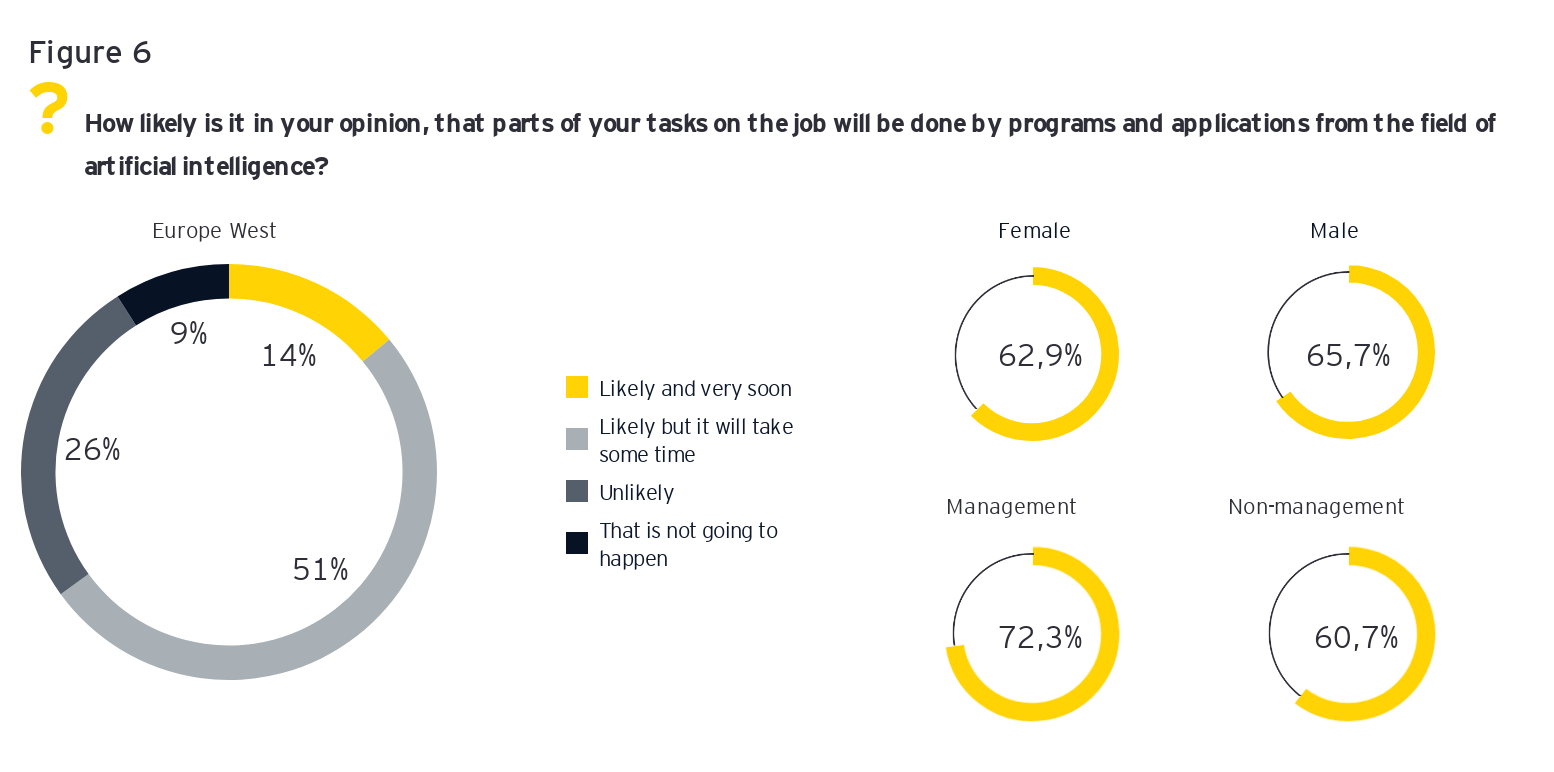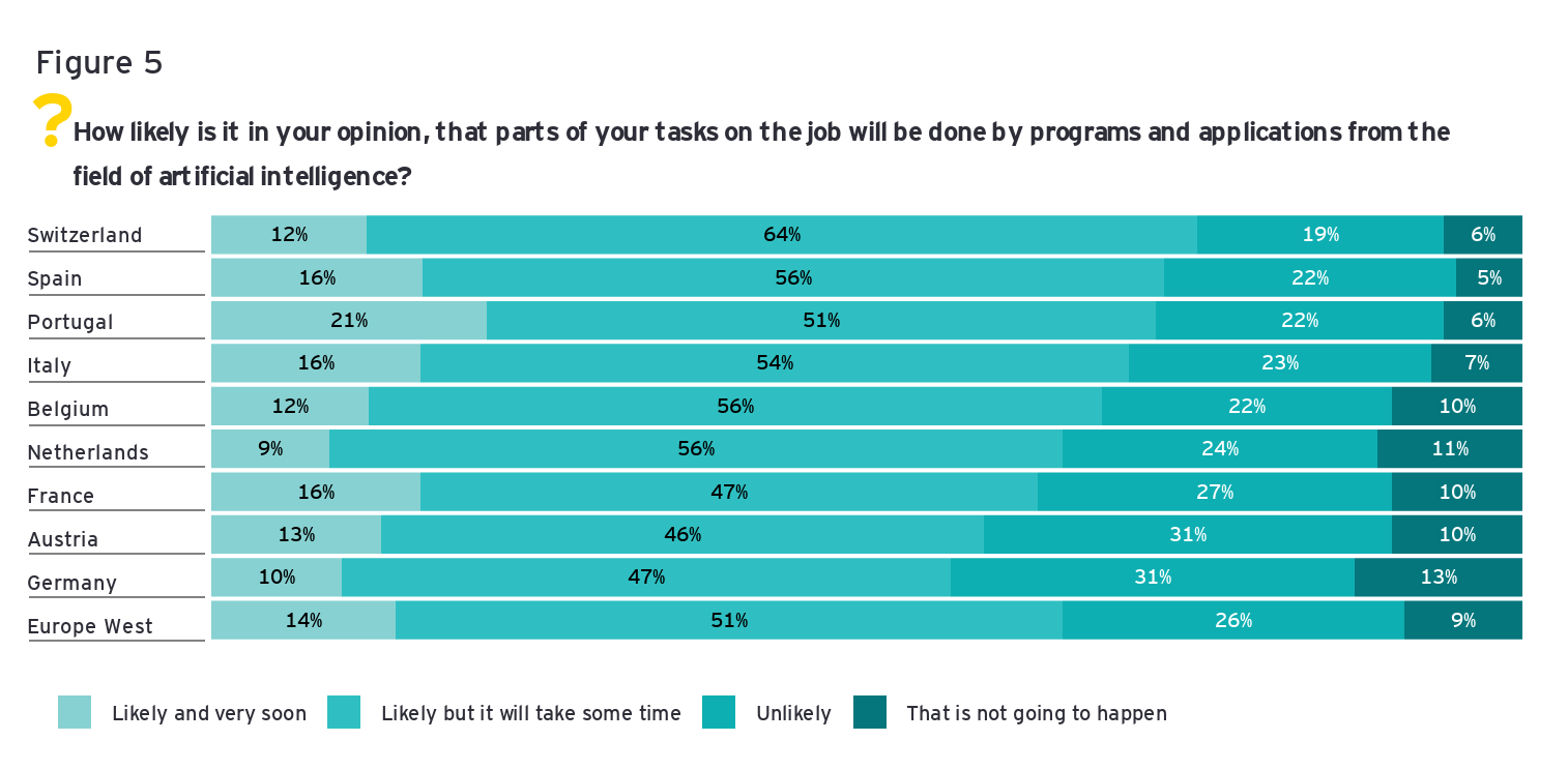As discussed in the previous section, most respondents expect artificial intelligence to take over elements of their work and redefine their job profiles. Analyzed by country, more than three out of four respondents in Switzerland (76%) assume that artificial intelligence will take over some of their tasks. This if followed by Spain and Portugal (72% each), Italy (70%), and Belgium (68%), where employees are likewise sure that – sooner or later – some of their tasks will be taken over by applications from the field of AI. The average among all respondents is 65%. In Germany (57%) and Austria (59%), the figure is below average.