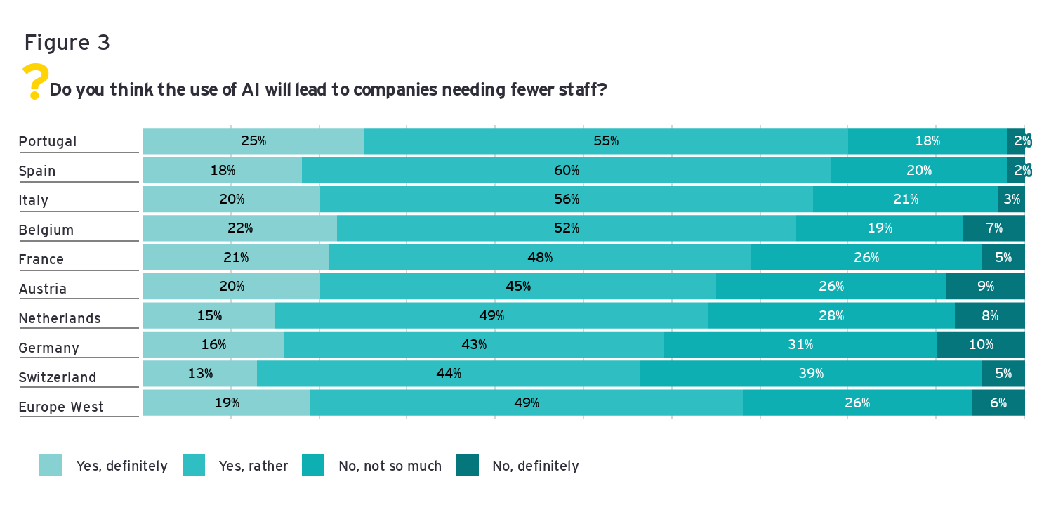 One in three respondents in Italy (34%) expects that the new technology will replace human labor on a large scale. The figure is similarly high in Portugal (31%). In contrast, the proportion is significantly lower among respondents in Germany (14%), Switzerland (16%), and Austria (17%).