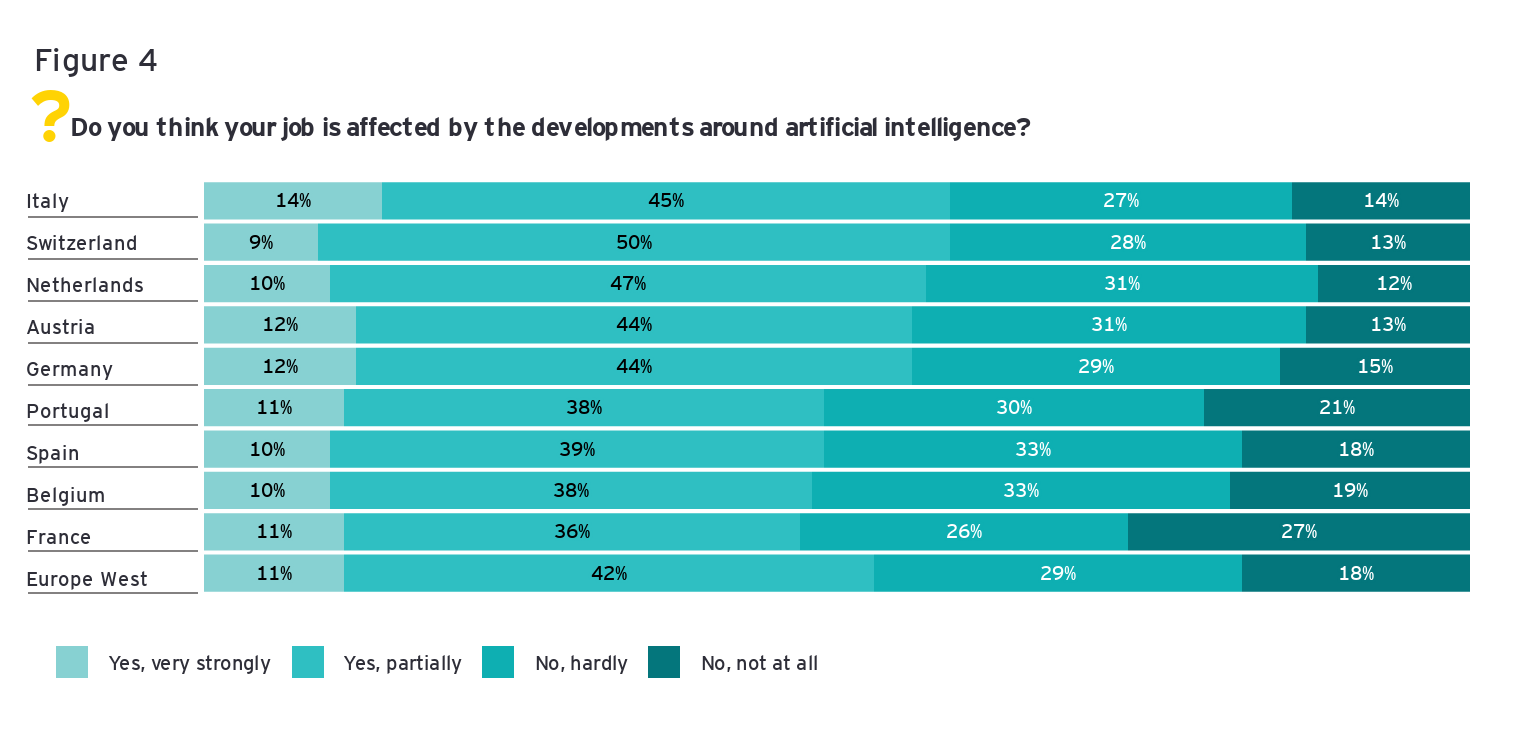 Figure 4 shows the general consensus among respondents across the nine analyzed European countries, with more than one in two (53%) stating that AI applications will influence their work – or are already doing so. In Italy and Switzerland (59% each), the figure is almost six out of ten. The proportion is also above average in the Netherlands (57%), and Austria and Germany (56%). On the other hand, it is below average in France (47%), Belgium (48%), as well as in Spain and Portugal (both 49%).