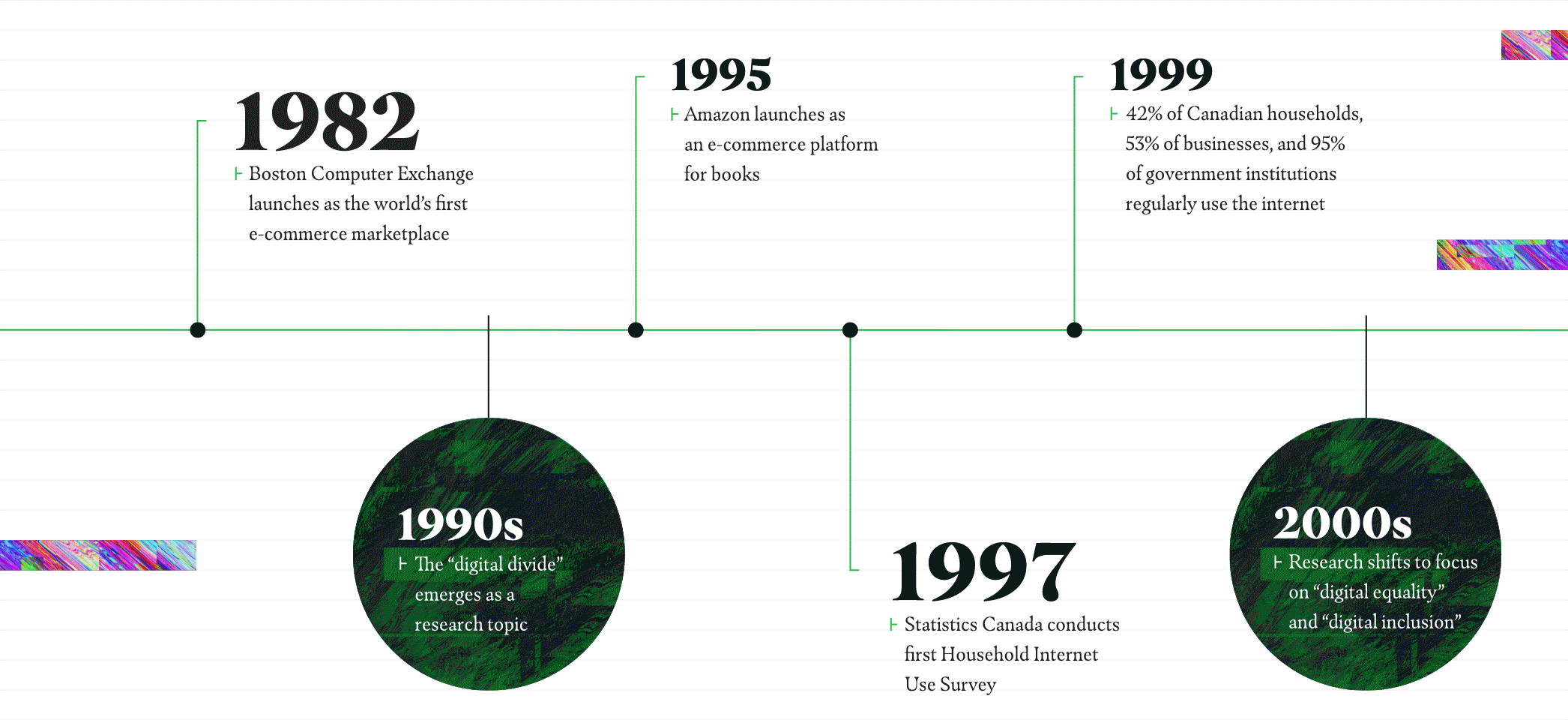 Meanwhile, the history of the digital economy reaches back to 1982, when the Boston Computer Exchange became the world’s first e-commerce marketplace. In 1995, Amazon launched as an e-commerce platform for books and, the following year, the Government of Canada launched its first website.7 In the years since then, Canadian organizations’ adoption of digital technology took off. By 1999, 98% of federal and provincial government institutions were using the internet.8 By 2006, 85% of Canadian private companies were using high-speed internet, and a year later online sales (B2B and B2C) reached $62.7 billion.9