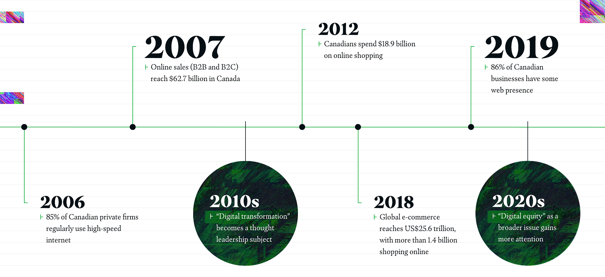 In the early 2010s, business strategies for digital transformation emerged as a major thought leadership issue, exploring how businesses needed to prepare for the new economy. In 2013, 46% of Canadian businesses had a website and 13% were selling online.10 The digital economy accelerated worldwide, with global e-commerce reaching US$25.6 trillion in 2018 and more than 1.4 billion people shopping online that same year.11 Today, the concept of the corporate digital divide has taken on greater urgency, as businesses at different levels of technological maturity have had very uneven experiences of the COVID-19 pandemic.