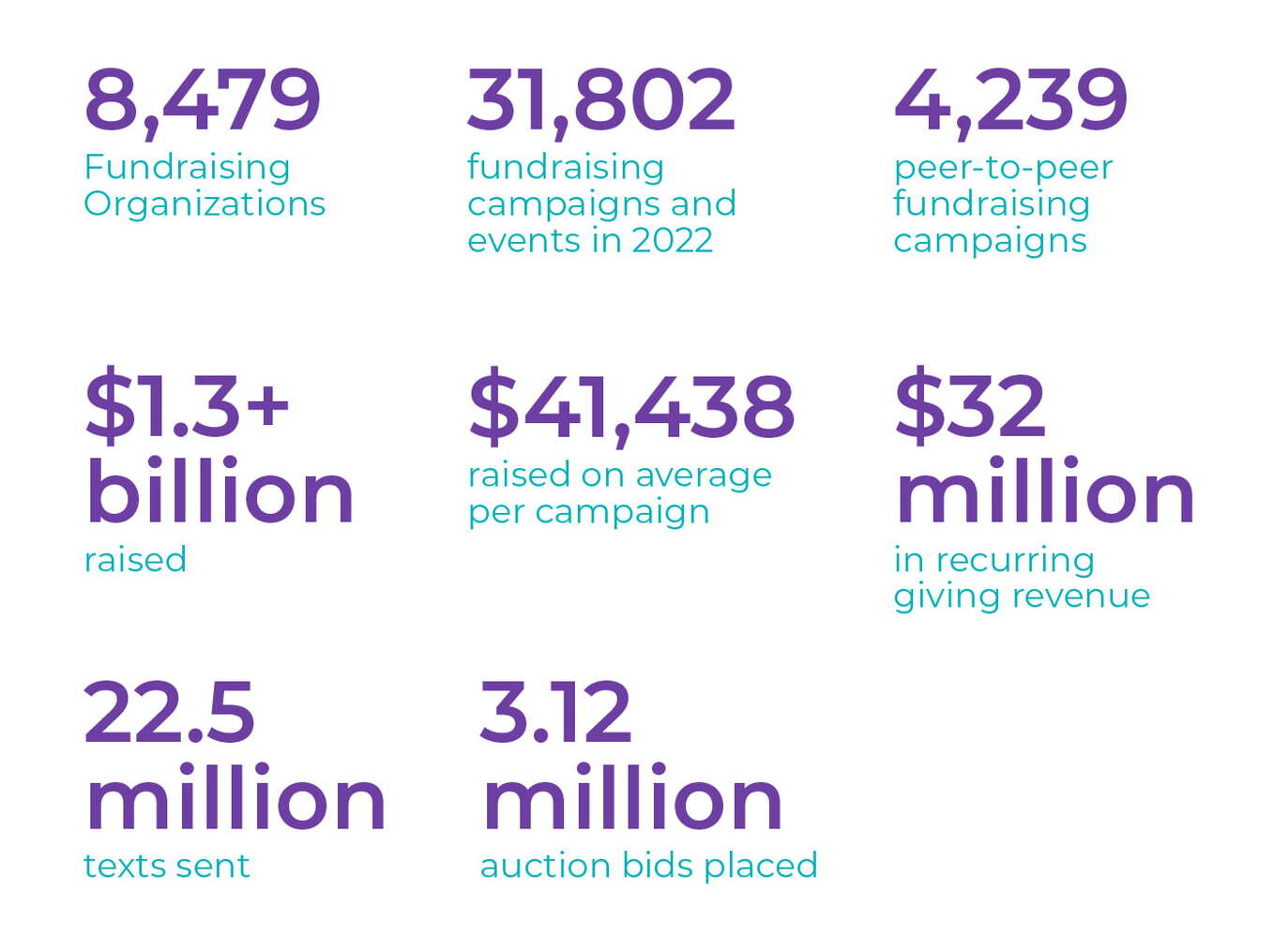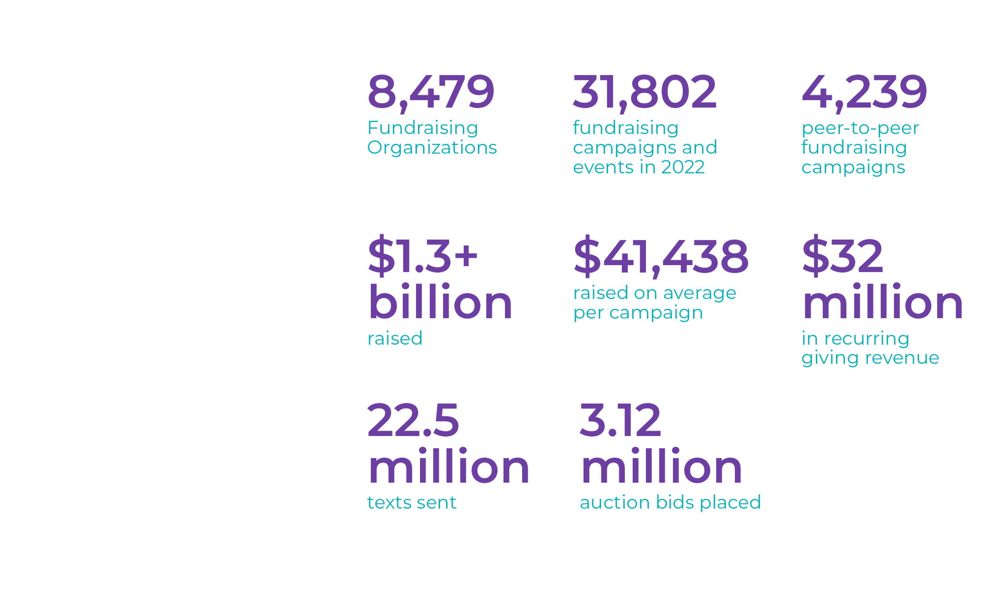 You are thriving and making more use of your annual subscription than ever before. YOU inspired donors to give. The impact of all of that on your constituents is incredible—with our customers supporting social services, healthcare, education, animal welfare, and more—it spans the globe. These numbers show what you collectively accomplished in 2022.