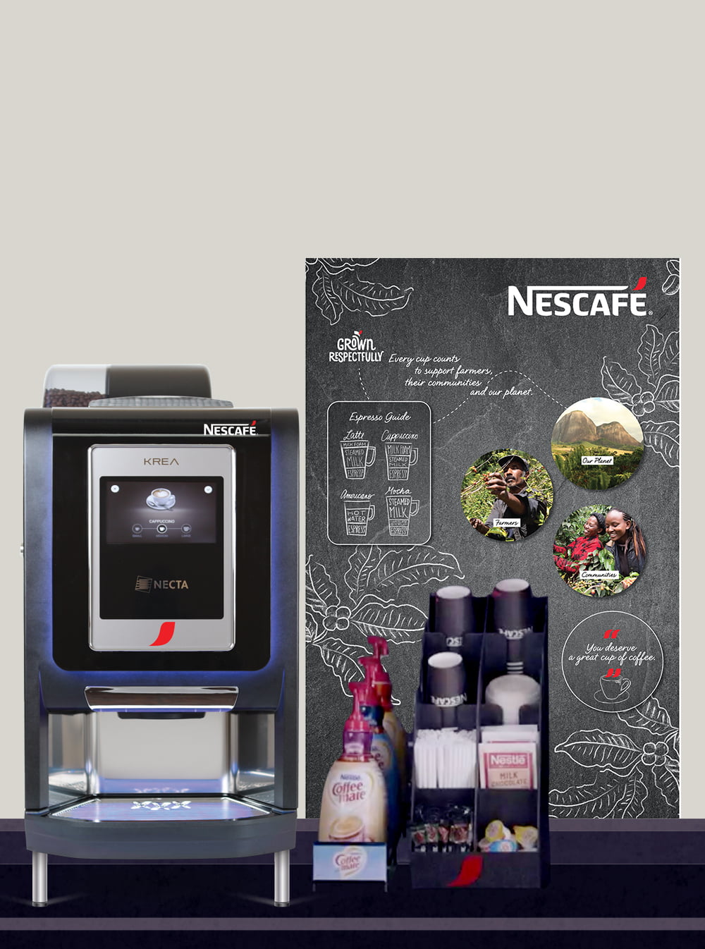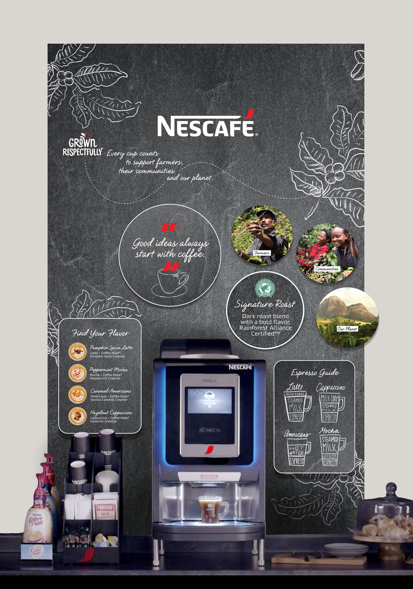 Drinking coffee is as much about the experience as it is about the drink. To make your breakroom, lounge, or cafeteria a favored destination, create a customer-centric coffee station that reflects their view of themselves and the world. Design the ideal coffee experience for your customers with NESCAFÉ®.