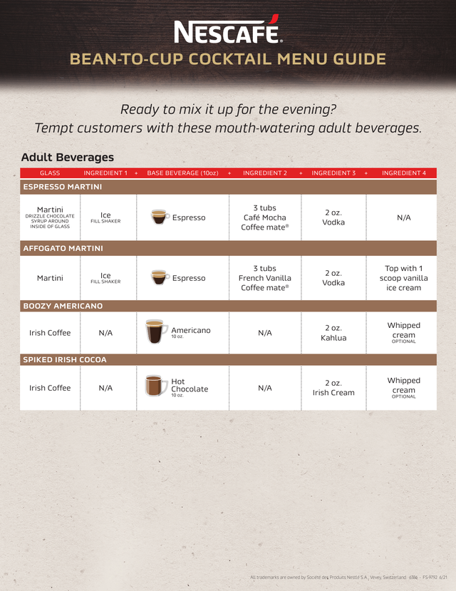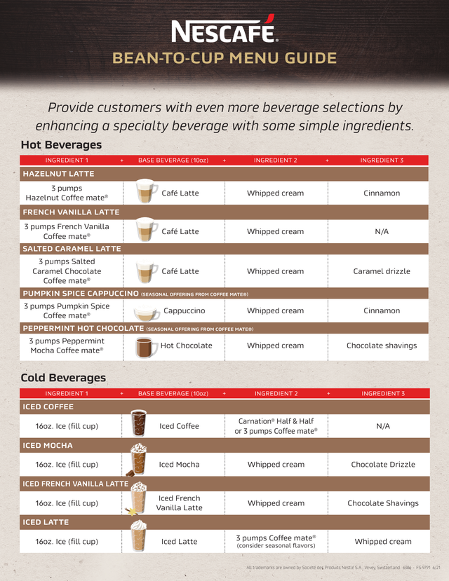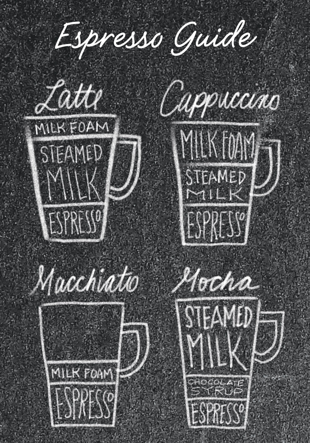 Cappuccino: Made with a third of espresso, a third of hot milk and a third of frothy milk foam. Sometimes a cappuccino is topped with chocolate shavings, cinnamon or sugar, adding to its dessert-like characteristics.
