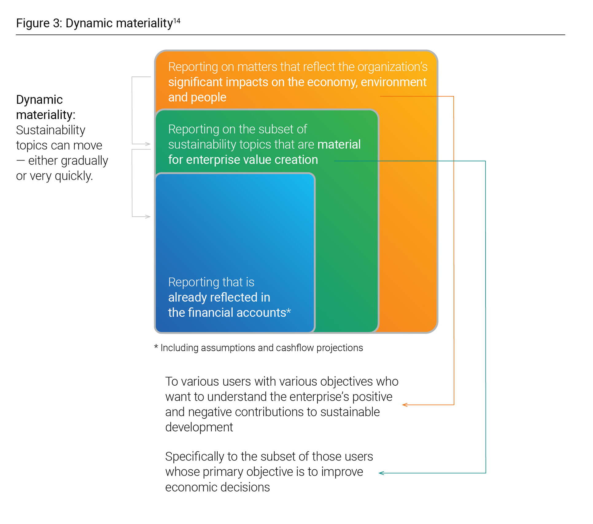 Identify and assess risks (and consider opportunities) — The sustainability objectives of the organization are linked integrally to each of the five categories of risk identified by ICIF-2013: operations, external financial reporting, external nonfinancial reporting, internal reporting, and compliance. These categories also require explicit expression as a predicate to considering risks. One of the insights provided in connection with Principle 6 under the Risk Assessment component of the framework is a discussion of materiality and the aforementioned concepts of dynamic materiality and impact accounting. The accompanying diagram from the ICSR guidance (Figure 3) was sourced from the “Statement of Intent to Work Together Towards More Comprehensive Corporate Reporting” to illustrate this discussion.13 It captures the “building blocks” approach to sustainability, reflecting the different materiality considerations for sustainability reporting and the potential movement of sustainability topics from one “block” to another. Additional risk identification issues include the consideration of immature information processes, risks related to estimates and expectations, risks related to third-party information, the impact of emerging trends, and fraud.