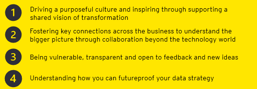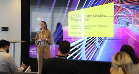 80% of technology executives believe that leadership skills are a key enabler of digital transformation success. 1 Bringing together a diverse group of IT leaders from Banking and Capital Markets, the EY UK CIO Future Leaders Program develops the next generation of CIOs through leadership training, coaching, networking and collective discussions on key industry topics − from sustainability, to operational excellence, and the FinTech ecosystem.