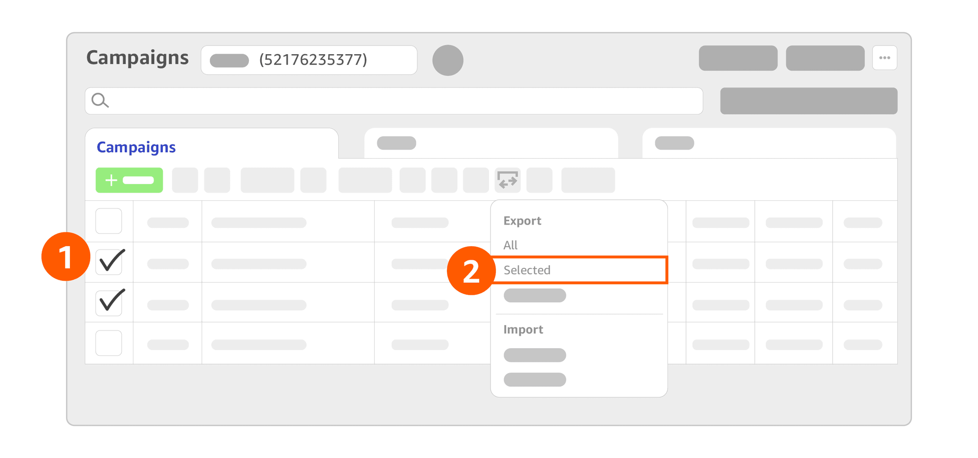 1. On the “Campaigns” page, check the campaign(s) that you want to measure. 2. Click the “Export/Import” icon and choose “Selected” under the “Export” section. If you want to measure all of your Facebook campaigns, select “All” under “Export”. 3. Copy the contents into the Amazon Attribution bulk file template and save it as an XLS/XLSX file.